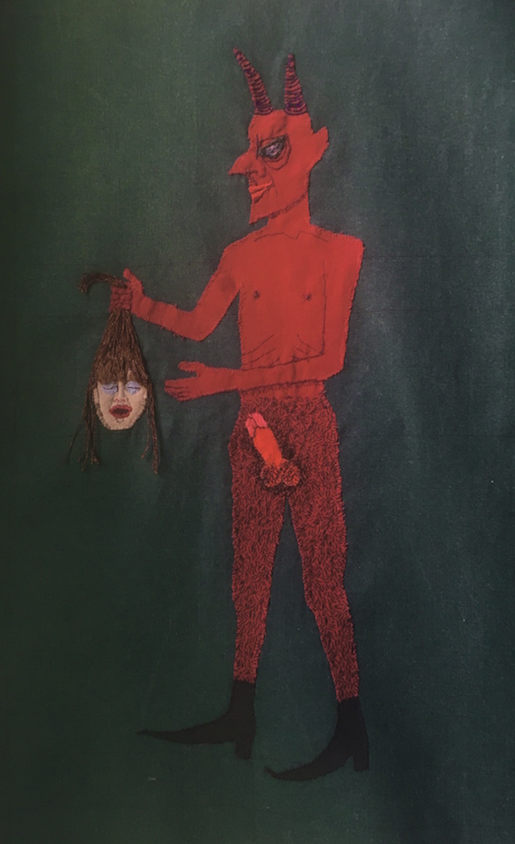 design work for the album, brüsseler platz by dominik von senger, 2019demon with severed head, 2020, embroidered thread & collaged fabric 44 x 31 cmcreature from hell 3, 2019, rusted metal, mackerel head, chicken feet, bark, firework case, glue, approx 28 cm tallinstallation for 48 std neukölln: luxus, 2011, mixed media, dimensions variable