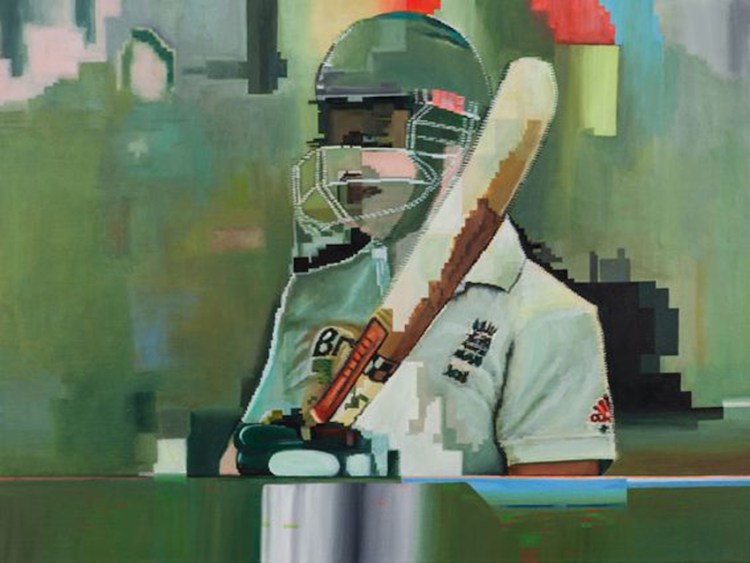 transcendence disambiguation, acrylic & marker on striped cotton, 2020, dimensions variablefootball, 2012, acrylic on canvas, varnished 60 x 80 cm, framedcricket, 2012, acrylic on canvas, varnished 60 x 80 cmjeffrey dahmer, 2011, goache & ink on textured paper, 30 x 20 cmgazza, 2010, acrylic on board, 100 x 140cmdennis nilsen, 2011, goache & ink on textured paper, 30 x 20 cm